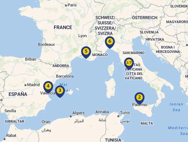 Spoznajte miesta, kde Vaša loď počas plavby zakotví! Každá zastávka je označená číslom, ktoré zodpovedá jej pozícii na mape, aby ste mohli jednoducho sledovať celú trasu. Stačí kliknúť na vybranú destináciu a zistíte viac o každej z nich. Pre ešte lepší prehľad si môžete celý program plavby prezrieť priamo na mape.