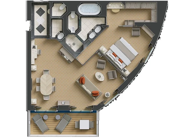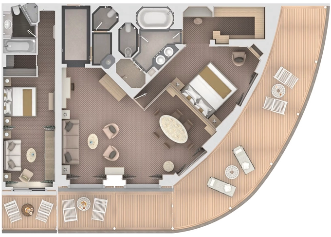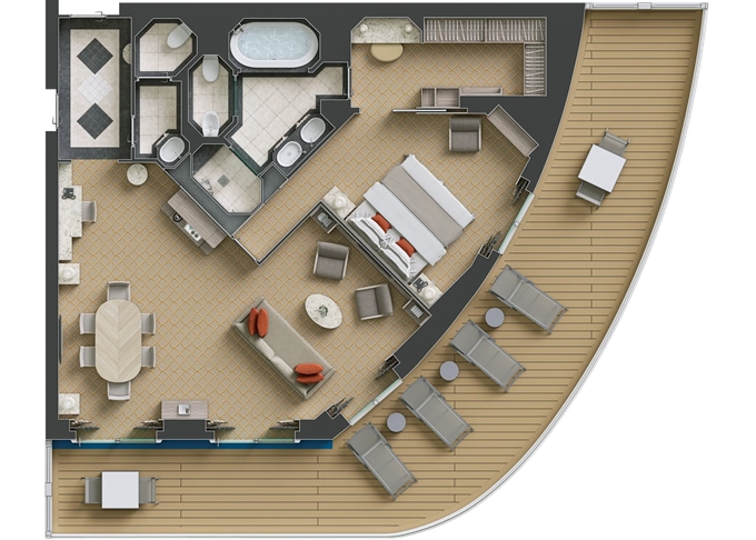 R1 - Royal Suite 1 105 m² (vrátane balkónu). 7. paluba vpredu. Max 3 osoby. 36 000 € 36 000 € za osobu