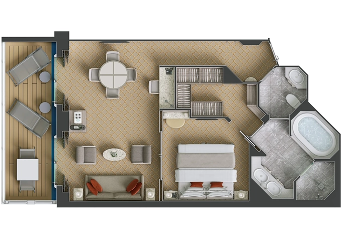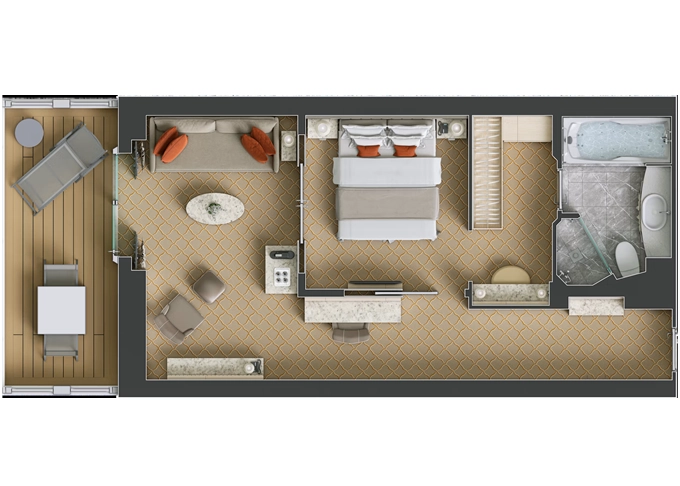 DX - Deluxe Veranda Suite 30 m² + balkón 6 m². 6,7,8. paluba - stred. Max 3 osoby. 14 700 € 14 700 € za osobu