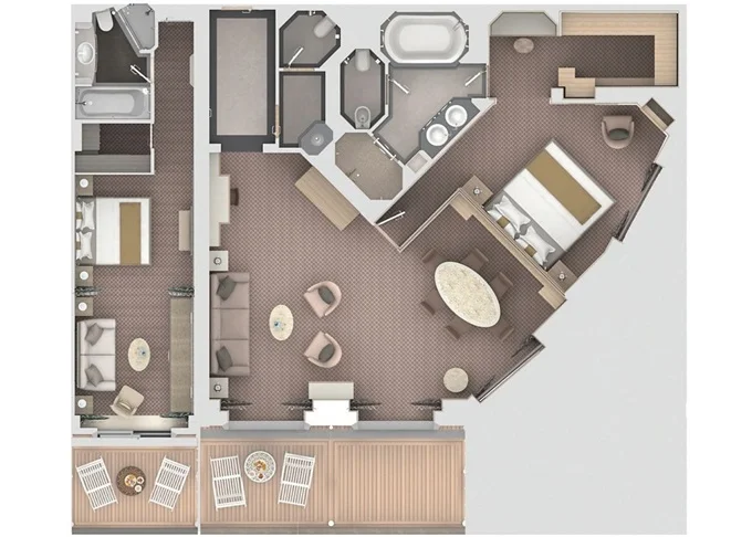 G2 - Grand Suite 2 137 m² (vrátane balkónov 44 m²). Grand Suite G1 spojená s Veranda Suite. 8,9. paluba vpredu. Max 5 osôb. 79 600 € 79 600 € za osobu